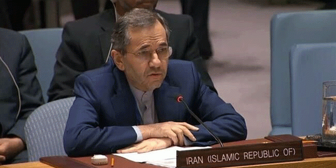 جدد مندوب إيران الدائم لدى منظمة الأمم المتحدة مجيد تخت روانجي موقف بلاده الداعي لاحترام سيادة سورية ووحدة أراضيها وعدم التدخل في شؤونها مندداً بالتواجد غير القانوني لقوات الاحتلال الأجنبية والتنظيمات الانفصالية والإرهابية في أجزاء من الأراضي السورية.