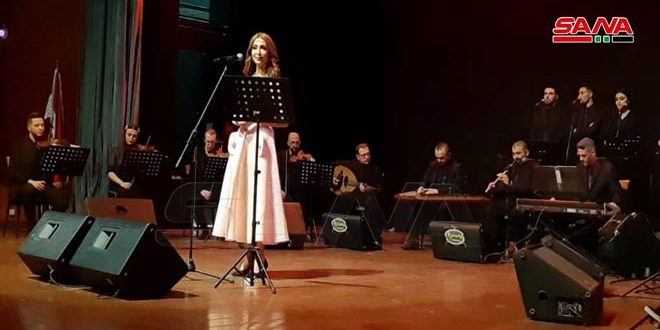 بصوتها الأنثوي الدافئ شدت المطربة ميرنا ملوحي على خشبة مسرح قصر دار الثقافة في حمص بأغنيات لنجوم الطرب في الزمنين الحالي والماضي.