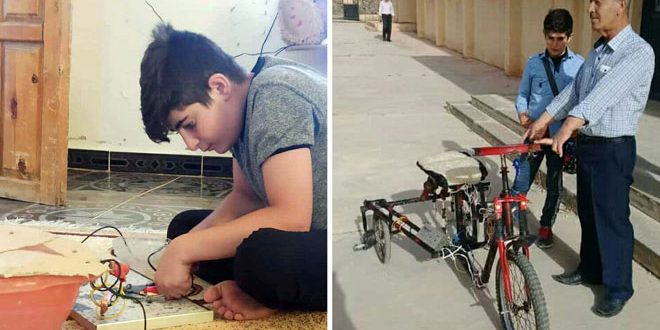 عمرو 13 عاماً استثمر هيكلاً معدنياً لدراجة هوائية قديمة ركب لها مقوداً عتيقاً أيضاً وثلاث عجلات مع أسلاك ومحرك جمع بينها موفراً لها القدرة على الحركة عبر الشحن بمدخرة لتكون بمثابة نواة لمشروع أكثر تطوراً في المستقبل حيث يأمل بتحويل الدراجة للعمل على الطاقة الشمسية كما ذكر خلال حديثه لمراسل سانا الشبابية.