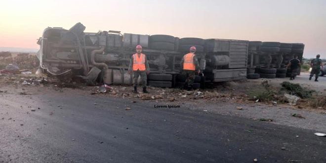 أصيب مواطن اليوم جراء تدهور شاحنة محملة بالقمح قرب مفرق نقيرة على طريق تحويلة حمص-طرطوس.