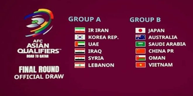 وضعت قرعة الدور الحاسم من التصفيات الآسيوية المؤهلة إلى نهائيات كأس العالم لكرة القدم في قطر 2022 والتي سحبت اليوم في العاصمة الماليزية كوالالمبور منتخب سورية في المجموعة الاولى إلى جانب منتخبات إيران وكوريا الجنوبية والإمارات ولبنان والعراق.