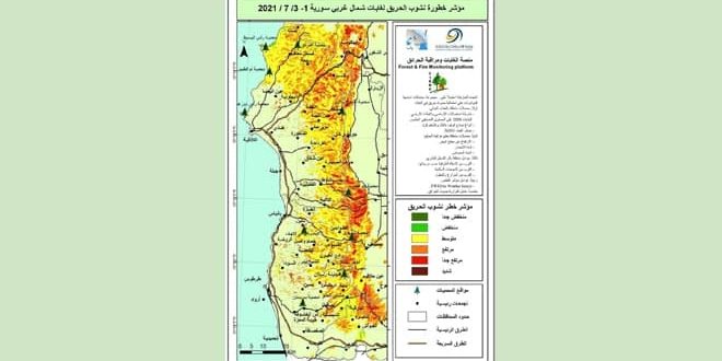 حذرت منصة الغابات ومراقبة الحرائق التابعة للهيئة العامة للاستشعار عن بعد من احتمال انتشار للحرائق ابتداء من اليوم الخميس وحتى الثالث من الشهر الجاري في مناطق غابات شمال غرب سورية.