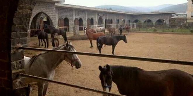 في قرية القبو الجبلية بريف حمص الغربي يستوقفنا مشهد جميل لمجموعة من الخيول السورية الأصيلة في مزرعة بنيت بحجر البازلت الأسود على شكل قناطر تعيد ذاكرتنا إلى ماضي أجدادنا العريق.