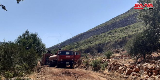 وأشار مدين العلي مدير مركز حماية الغابات لمراسل سانا في وقت سابق إلى أن “النيران اندلعت بالقرب من مكان اندلاع الحريق الذي تم إخماده يوم أمس والنيران تتمدد في حراج المنطقة بسبب وعورة الجبال وقد تم إرسال فريق لإخمادها مكون من 3 صهاريج وأكثر من40 إطفائياً يعملون على قطع خطوط النار للتصدي لتقدم تلك النيران”.