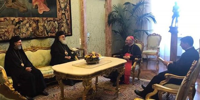وشدد البطريرك يوحنا العاشر خلال لقائه وزير خارجية الكرسي الرسولي الكاردينال برولين في القصر الرسولي بالفاتيكان على ضرورة تكثيف الجهود لرفع الإجراءات القسرية الأمريكية والأوروبية المفروضة على سورية والتي تطال المواطن في لقمة عيشه.