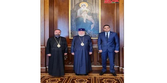 بحث كاثوليكوس عموم الأرمن كاريكين الثاني وسفير سورية لدى جمهورية أرمينيا محمد حاج إبراهيم علاقات الصداقة بين البلدين وسبل تطويرها وجهود إعادة إعمار ما دمره الإرهاب في سورية.