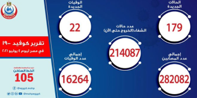 أعلنت وزارة الصحة والسكان المصرية تسجيل 179 إصابة جديدة و22 حالة وفاة بفيروس كورونا خلال الساعات الأربع والعشرين الماضية.