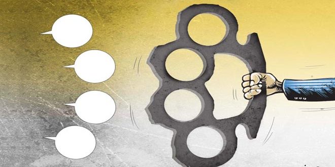 وتصور لوحة خليل الفائزة مجموعة أفكار في مواجهة القبضة الحديدية في إشارة إلى دور الحوار وإلى أن الكلمة أقوى من أي سلاح.