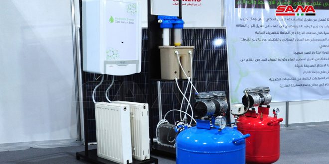 وفي جناح المركز الوطني لبحوث الطاقة يعرض المخترع إياد زهران اختراعه المتمثل بمنظومة التدفئة الهدروجينية الخضراء والتي تعد الأولى من نوعها على مستوى الشرق الأوسط والعالم وتفيد في حل مشكلة التدفئة عند فقدان مادة المازوت، لافتاً إلى أن الوقود الهيدروجيني هو البديل المجاني والنظيف من مازوت التدفئة وغاز الطهي كما أن المنظومة آمنة ولا تصدر ضجيجا وتتم التدفئة عن طريق تسخين الماء وتوزيع الهواء الساخن الناتج عن عملية الاحتراق الصديقة للبيئة.