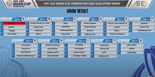 أوقعت قرعة التصفيات المؤهلة إلى كأس آسيا في أوزبكستان 2022 تحت 23 عاماً منتخب سورية الأولمبي لكرة القدم في المجموعة الأولى إلى جانب منتخبات قطر واليمن وسيرلانكا والتي ستجري مبارياتها في الدوحة بنظام التجمع من مرحلة واحدة بالفترة ما بين الـ23 والـ30 من تشرين الأول المقبل.