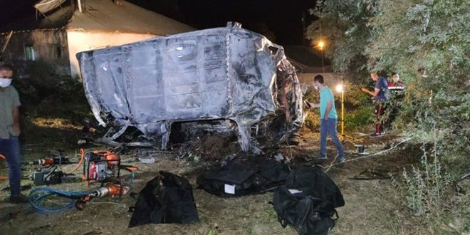 وذكرت وكالة أنباء الأناضول الناطقة باسم النظام التركي اليوم أن حافلة ركاب صغيرة كانت تقل مهاجرين غير شرعيين انقلبت في منطقة المرادية بالمحافظة ومن ثم اندلعت فيها النيران ما أسفر عن مصرع 12 شخصاً وإصابة 20 آخرين.