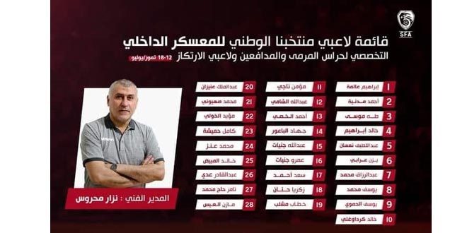 أعلن المدير الفني لمنتخب سورية للرجال بكرة القدم نزار محروس عن قائمة اللاعبين المدعوين للمشاركة في المعسكر الداخلي التخصصي لحراس المرمى والمدافعين ولاعبي الارتكاز والذي سيبدأ غداً وينتهي في الثامن عشر من الشهر الجاري استعداداً للدور الحاسم من التصفيات الأسيوية المؤهلة إلى كأس العالم.