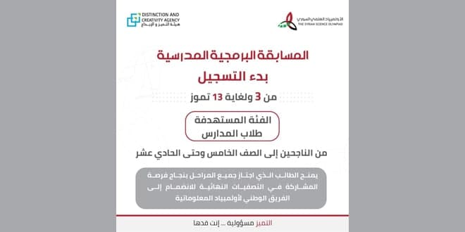 يستمر التسجيل في المسابقة البرمجية المدرسية لطلاب الصف الخامس الابتدائي حتى الصف الحادي عشر التي أعلنت عنها إدارة الأولمبياد العلمي السوري في هيئة التميز والإبداع لغاية الثالث عشر من شهر تموز الجاري عبر ملء الاستمارة الموجودة على صفحة الهيئة الرسمية على موقع التواصل الاجتماعي “فيسبوك”.