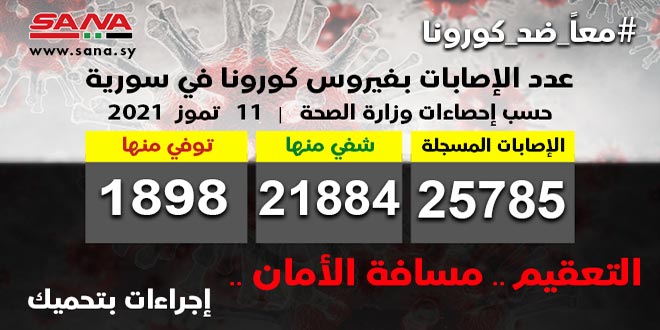وأوضحت الوزارة في بيان تلقت سانا نسخة منه أن عدد الإصابات المسجلة في سورية بلغ حتى الآن 25785 شفيت منها 21884 وتوفيت 1898 حالة.