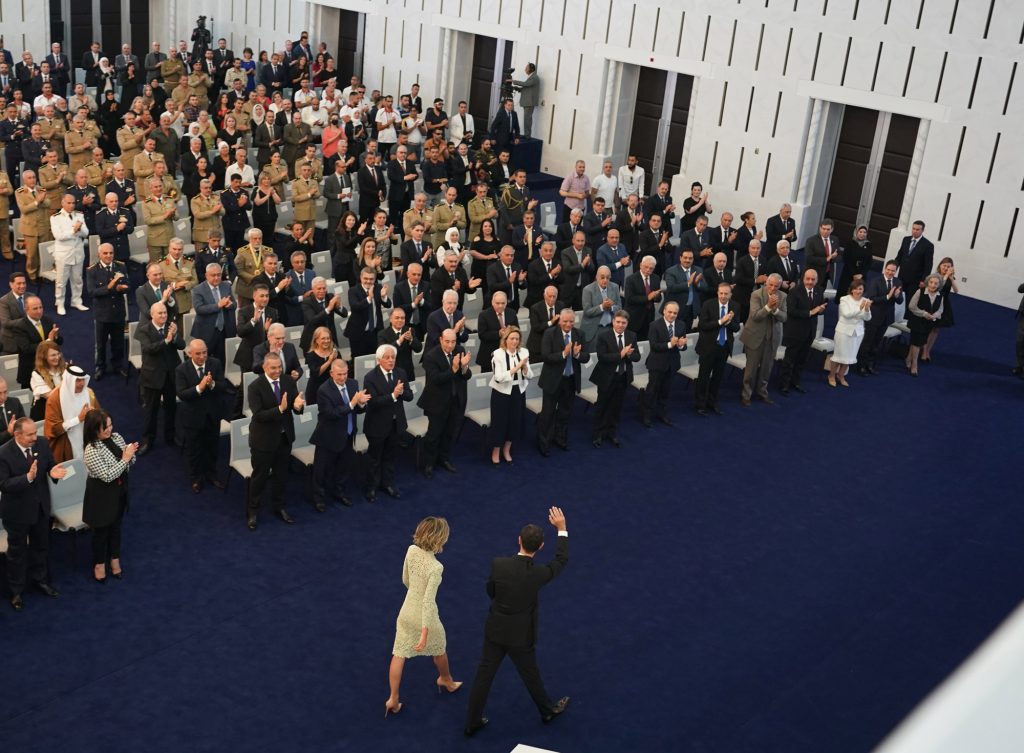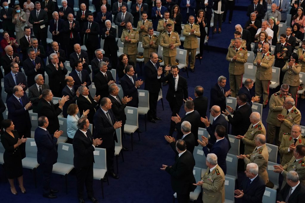 وكان الرئيس الأسد استعرض قبل دخوله القاعة الرئيسية في قصر الشعب حرس الشرف وتشكيلات من الجيش العربي السوري بعد عزف النشيد العربي السوري.