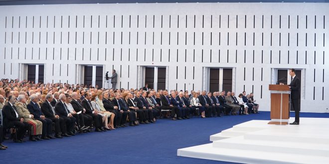 وتابع الرئيس الأسد: السيدات والسادة، في إطار كل ما سبق تبقى قضية تحرير ما تبقى من أرضنا نصب أعيننا، تحريرها من الإرهابيين ومن رعاتهم الأتراك والأمريكيين، والسير في عملية التحرير على مراحل خلال السنوات الماضية كان يهدف لإعطاء المجال للراغبين بالعودة إلى حضن الوطن من جانب، ولإعطاء الفرصة للتحركات السياسية للأصدقاء من جانب آخر، هذه التحركات تهدف إلى إقناع رعاة الإرهاب بالتخلي عن نهجهم وإقناع الإرهابيين بالانسحاب من المناطق التي يحتلونها حقناً للدماء ومنعاً للدمار، وقد حققت هذه السياسة نتائج مرضية في عدد من المناطق وأخفقت في أخرى، وكان الحل الوحيد دخول قواتنا المسلحة إليها والقضاء على الإرهاب وتحرير السكان المدنيين وفرض سلطة القانون، وسنستمر في اتباع هذه السياسة لتحرير باقي أرضنا، ونحن نعلم أن التركي غادر وأن الأمريكي مخادع لكننا لا نفوت فرصة إلا ونستخدمها حرصاً على الأرواح وتفنيداً لأكاذيب الأعداء وأيضاً ثقة بدور الأصدقاء كإيران وروسيا الذين كان لهم في وقوفهم إلى جانبنا فضل وأثر كبيران على مسار الحرب وتحرير الأراضي بالإضافة إلى دور روسيا والصين في تغيير وجهة المسار الدولي انطلاقاً من دفاعهما عن القانون والشرعية الدوليين.