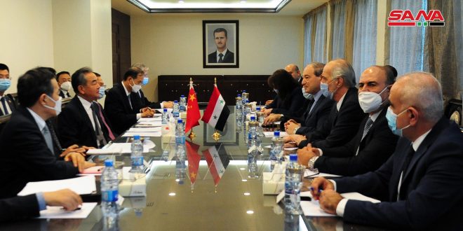 عقد الدكتور فيصل المقداد وزير الخارجية والمغتربين في حكومة تسيير الأعمال ووزير الخارجية الصيني وانغ يي والوفد المرافق جلسة مباحثات سياسية واقتصادية ناقشا فيها المواضيع ذات الاهتمام المشترك بين البلدين.
