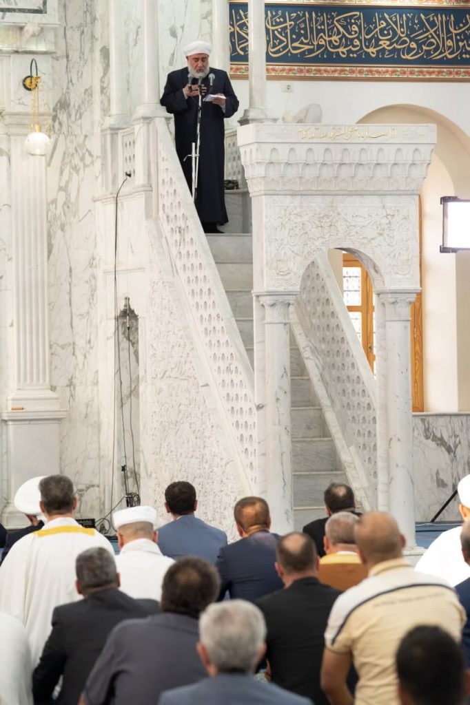 وألقى الشيخ المصري خطبة العيد أكد فيها على معاني العيد السامية التي تعلم الإنسان الصبر وترسخ فيه قيم التضحية والفداء وقيمة الشهادة في سبيل الدفاع عن الوطن ومنزلتها عند الله عز وجل.