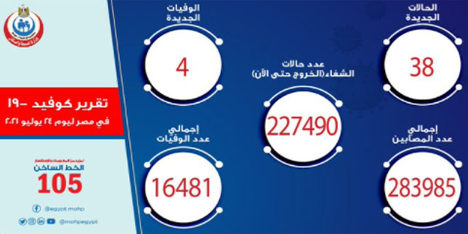 أعلنت وزارة الصحة والسكان المصرية تسجيل أربع حالات وفاة بفيروس كورونا المستجد و38 حالة إصابة خلال الأربع وعشرين ساعة الماضية.