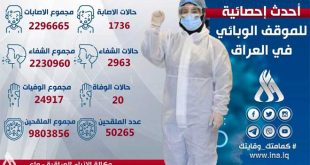 وقالت الوزارة في بيان لها اليوم أن العدد الإجمالي للمصابين بالفيروس في إيران منذ انتشار الجائحة بلغ 3691432 تعافى منهم 3256856 شخصاً فيما توفي 88800 آخرون.