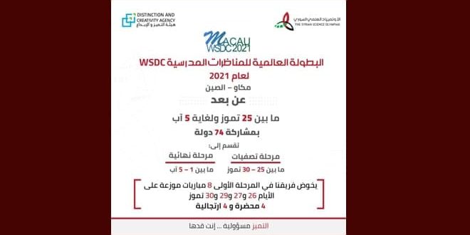 بمشاركة سورية انطلقت اليوم منافسات البطولة العالمية للمناظرات المدرسية WSDC لعام 2021 التي تنظمها مدينة ماكاو في الصين “عن بعد” لطلاب المرحلة الثانوية وتستمر لغاية الخامس من شهر آب القادم بمشاركة 74 دولة.