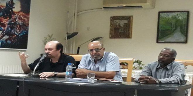 الندوة التي أدراها الأديب سامر منصور حضرها رئيس اتحاد الكتاب العرب الدكتور محمد الحوراني وأعضاء المكتب التنفيذي في الاتحاد.