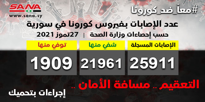 وأوضحت الوزارة في بيان تلقت سانا نسخة منه أن عدد الإصابات المسجلة في سورية بلغ حتى الآن 25911 شفيت 21961 وتوفيت 1909 حالات.