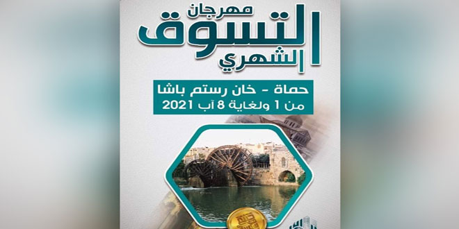 يشهد خان رستم باشا الأثري بمدينة حماة غداً انطلاق الدورة الـ 121 من مهرجان التسوق الشهري صنع في سورية ويستمر حتى الثامن من شهر آب المقبل.
