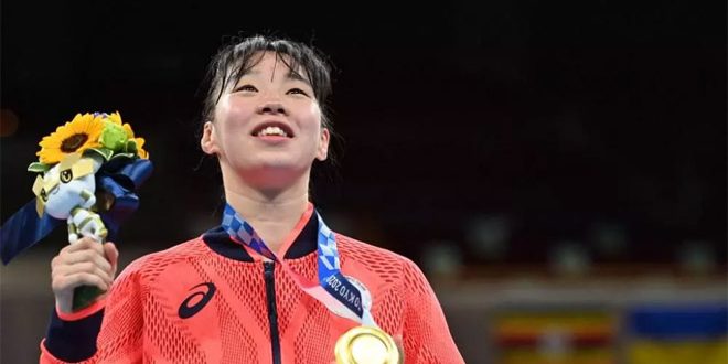 أحرزت اليابانية إيريئيه سينا الميدالية الذهبية في منافسات الملاكمة للسيدات وزن الريشة بأولمبياد طوكيو.