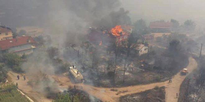 واندلعت الحرائق في عدة ولايات جنوب وجنوب غرب تركيا ضمنها أنطاليا وأضنة وموغلا ومرسين وعثمانية وأعلنها رئيس النظام التركي رجب طيب أردوغان مناطق منكوبة ورغم السيطرة على العديد من نقاط الحرائق في مدن بالساحل الجنوبي للبلاد تتواصل حرائق الغابات بمنطقتي إيجة والبحر المتوسط لليوم الثامن على التوالي.