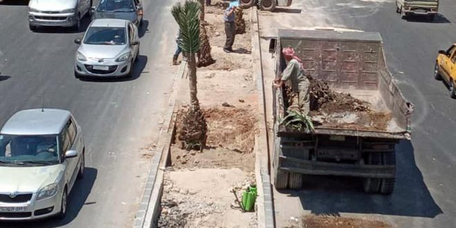 وفي إطار الاهتمام بالجانب الجمالي والبيئي للمدينة قامت ورشات مديرية الحدائق بالمحافظة بزراعة 21 شجرة نخيل مثمر بمنصف شارع الثورة وذلك ضمن أعمال إعادة تأهيله وفق ما ذكر مدير الحدائق المهندس سومر فرفور موضحاً أنه تم إحضار الأشجار من مشتل العدوي التابع للمحافظة بطريقة عملية بغية الحفاظ عليها.