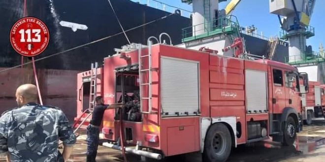 أخمد عناصر فوج إطفاء اللاذقية ودائرة الدفاع المدني في شركة مرفأ اللاذقية اليوم حريقاً نشب في سفينة أثناء عملية الصيانة التي تجري لها ضمن المرفأ.