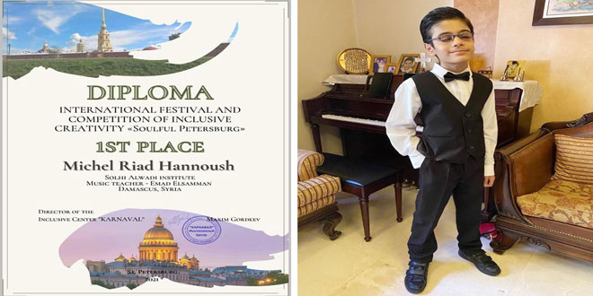 فاز الطالب السوري ميشيل حنوش من معهد صلحي الوادي للموسيقا بالجائزة الأولى على مستوى العالم في مسابقة الإبداع الشامل “soulful Petersburg” بالمهرجان الدولي في مدينة بطرسبورغ في روسيا.