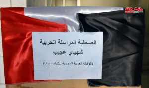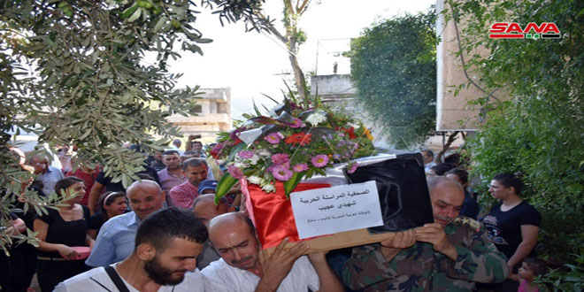 بمشاركة أهالي قرية نهر البارد والزملاء في الوكالة العربية السورية للأنباء سانا وعدد من الإعلاميين تم عصر اليوم تشييع جثمان الزميلة الصحفية والمراسلة الحربية شهيدي عجيب إلى مثواه الأخير في قرية نهر البارد بريف حماة.