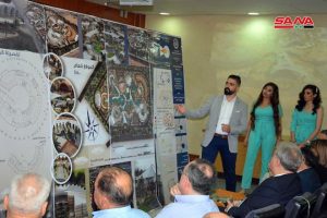 الطلاب سارة إدريس وجورج إبراهيم وحنا طنوس لفتوا إلى أن مشروعهم تضمن إقامة مجمع سياحي بيئي في وادي النضارة باعتباره من المناطق السياحية المهمة في سورية.