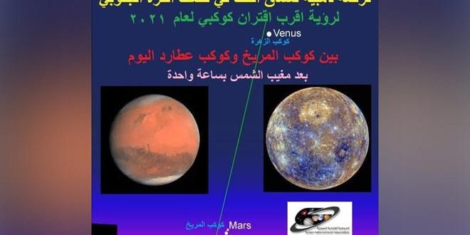 يتزاور كوكبا المريخ وعطارد مساء اليوم في أقرب نقطة لهما ظاهرياً إلى حد التطابق والتعانق.