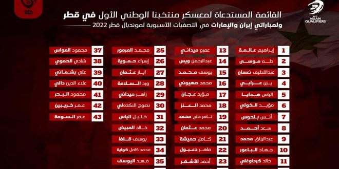 يتوجه منتخب سورية لكرة القدم للرجال بعد غد إلى قطر لإجراء معسكر تدريبي استعدادا للدور الحاسم من تصفيات كأس العالم 2022 والذي سينطلق في الثاني من الشهر القادم.