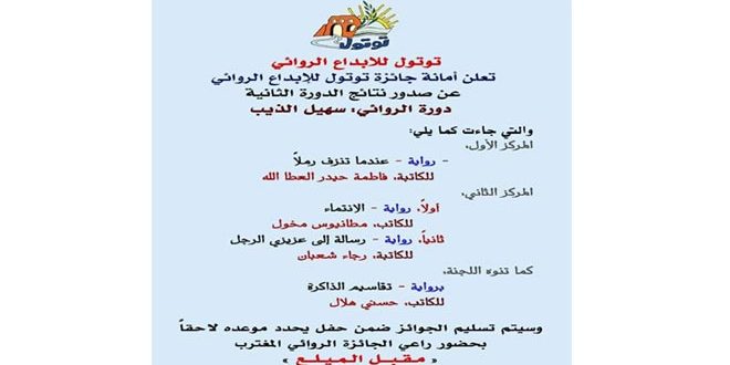 أعلنت اليوم نتائج جائزة الإبداع الروائي بدورتها الثانية باسم الأديب سهيل الديب التي تقيمها دار توتول للطباعة والنشر.