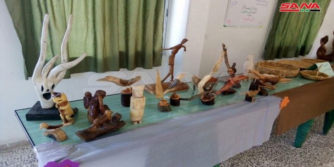 قدم خمسة من حرفيي محافظة طرطوس خلال معرض في بلدة القمصية باقة من أعمالهم اليدوية التراثية التي تنوعت بين النحت والحرق على الخشب والمهن التقليدية القديمة المشغولة من القش والخيزران والفخار.