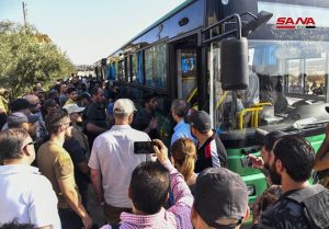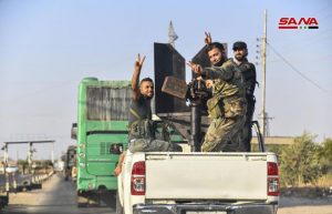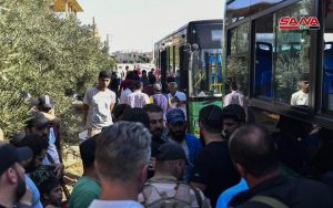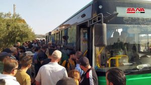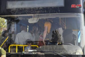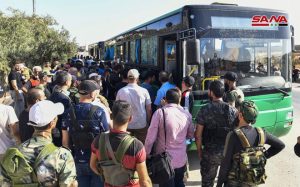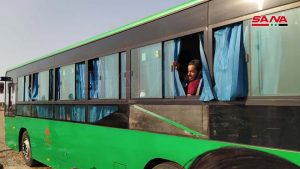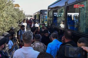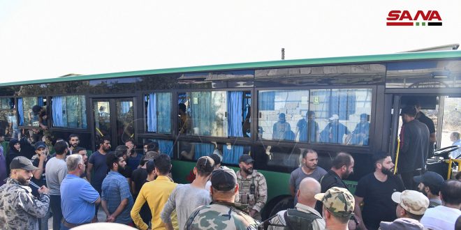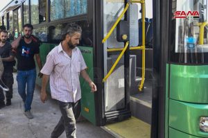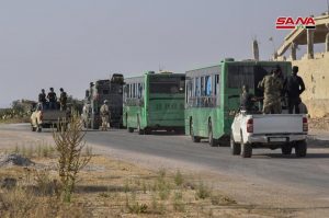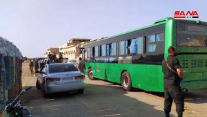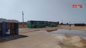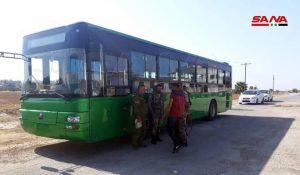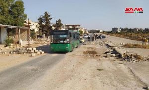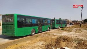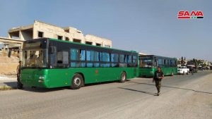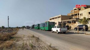 ولفت مراسل سانا الحربي في درعا إلى أنه مع اقتراب انتهاء المهلة المحددة لخروج الإرهابيين دخلت حافلتان عبر ممر الجمرك القديم إلى منطقة درعا البلد وصعد إليهما 45 إرهابياً مع بعض أفراد عائلاتهم وتوجهتا بعد تدقيق الأسماء من قبل الجهات المختصة إلى شمال البلاد وذلك تنفيذاً لاتفاق تم التوصل إليه يقضي بإخراج الإرهابيين الرافضين للتسوية وتسوية أوضاع المطلوبين وإعادة الأمن للحي ونشر نقاط عسكرية فيه.