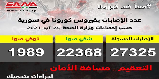 وأوضحت الوزارة في بيان تلقت سانا نسخة منه أن عدد الإصابات المسجلة في سورية بلغ حتى الآن 27325 شفيت منها 22368 وتوفيت 1989 حالة.