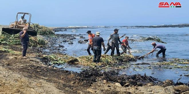 تواصل عمليات إزالة بقع تلوث الفيول التي تسربت من المحطة الحرارية في بانياس ووصلت إلى شاطئ جبلة