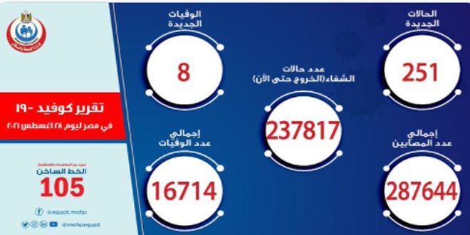 أعلنت وزارة الصحة والسكان المصرية تسجيل 8 حالات وفاة و251 حالة إصابة جديدة بفيروس كورونا المستجد خلال الأربع وعشرين ساعة الماضية في مصر .