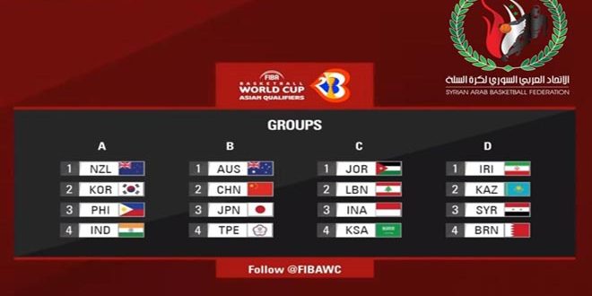 أوقعت قرعة تصفيات كأس العالم لكرة السلة التي أقيمت اليوم في مدينة مايز السويسرية منتخب سورية للرجال في المجموعة الرابعة رفقة منتخبات إيران وكازاخستان والبحرين والتي ستبدأ في شهر تشرين الثاني المقبل.