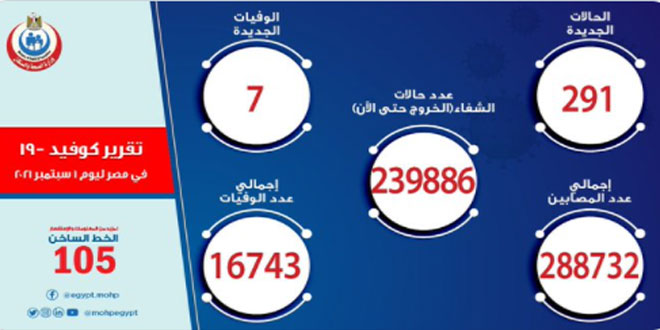 أعلنت وزارة الصحة المصرية تسجيل سبع حالات وفاة و291 إصابة جديدة بفيروس كورونا خلال الساعات الـ 24 الماضية.