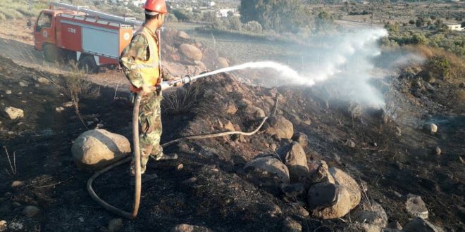أخمد كوادر إطفاء حمص اليوم حريقاً اندلع بأعشاب يابسة وأشجار زيتون في الأراضي الزراعية لقرية حالات بمنطقة تلكلخ بريف حمص الغربي.