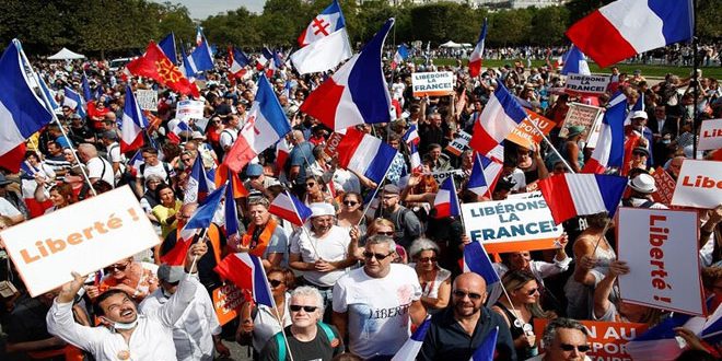 وأفادت وكالة فرانس برس بأن آلاف المتظاهرين نزلوا إلى الشوارع في عدد من المدن وفي مقدمتها باريس أمس احتجاجاً على سياسات الحكومة الخاصة بمكافحة كورونا وإلزامية التطعيم باللقاحات المضادة للفيروس للعاملين في مهن معينة.