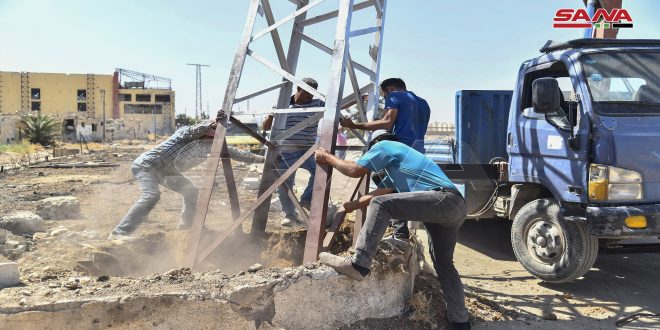 بدوره أوضح رئيس دائرة الصيانة العامة في الشركة المهندس أيمن دويري أن العمل يجري حالياً لنصب أبراج التوتر المتوسط والبالغ عددها 17 برجاً ومد كابلات أرضية بطول 3.5 كم وشد شبكات هوائية بطول 2 كم لتأهيل مركزي الحجر الأسود 57 و7 باستطاعة ألف كيلو فولط لكل مركز.