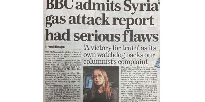 أقرت هيئة الإذاعة البريطانية (بي بي سي) أن الفيلم الوثائقي الذي أذيع عبر قناتها (راديو 4) في شهر تشرين الثاني من العام الماضي حول الهجوم الكيميائي المزعوم في مدينة دوما عام 2018 يحتوي أخطاء خطيرة وادعاءات كاذبة.