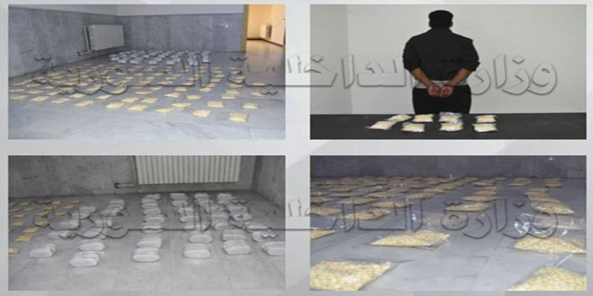 وذكرت وزارة الداخلية في بيان تلقت سانا نسخة منه أنه بعد المتابعة والمراقبة تمكن عناصر فرع مكافحة المخدرات بحمص من إلقاء القبض على المدعو محمد.ش في مزارع الأوراس بالمحافظة وضبط بحوزته كيلو وأربعمئة غرام من حبوب الكبتاغون المخدرة أي حوالي 8000 حبة ضمن ثمانية أكياس.